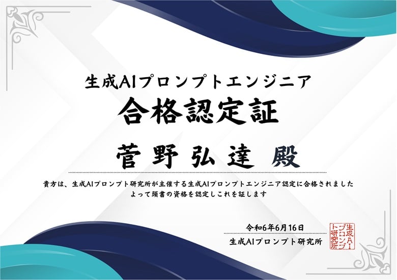 これらの講義では、最新の成功事例と具体的な活用方法をお伝えします。また、私自身も2024年には日本最大級のオンラインChatGPTスクール「飛翔」に入校し、「生成AIプロンプトエンジニア認定」を取得するなど、学び続ける姿勢を大切にしています。