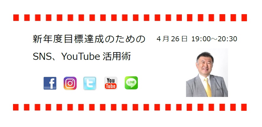 4月26日/「新年度目標達成のためのSNS、YouTube活用術」(ZOOMオンラインセミナー)