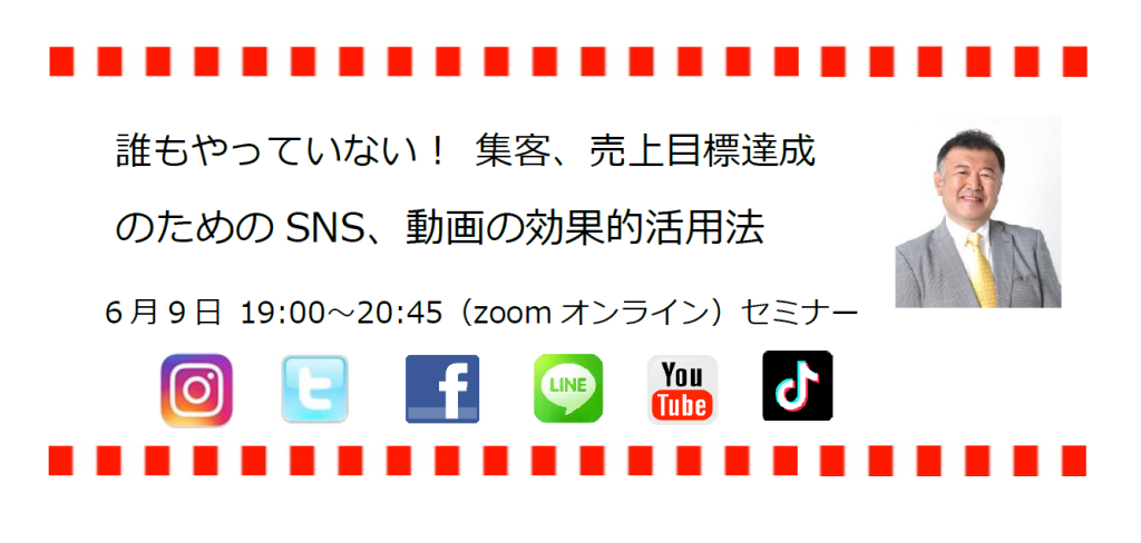 6月9日/誰もやっていない! 集客、売上目標達成のためのSNS、動画の効果的活用法(ZOOMオンラインセミナー)